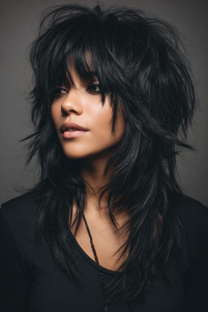 It offers modern, rebellious takes on the shag and mullet cuts. The hair color is a deep, rich black. The cut features short, dense layers on top that transition into long, thin layers in the back. These layers give the hair maximum volume and texture. The front has a messy fringe that falls over the eyes and short strands that frame the face. The “just-woken-up” look of the hair adds a cool, effortless vibe to the style. To complement this style, a smoky and mysterious eye makeup look has been chosen. This cut is ideal for those with thick, voluminous hair who want to control their volume and achieve an extraordinary look.