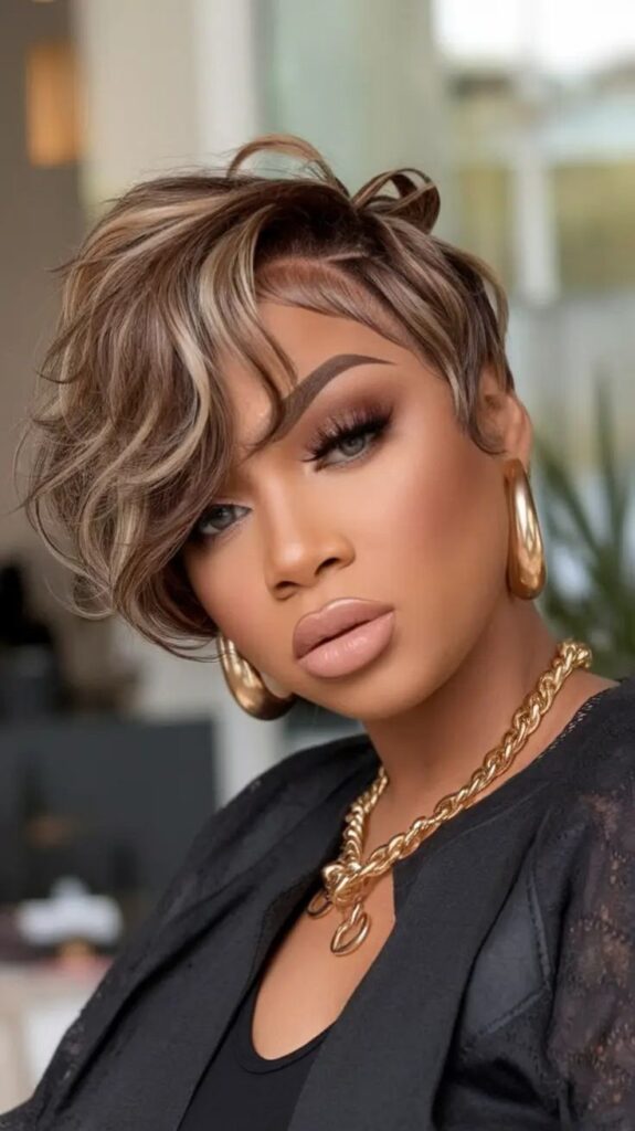 This cut offers an extremely stylish and modern take on the classic pixie cut. The asymmetrical cut features one side that is cut close to the ear and another side that is longer and forms a layered fringe that falls onto the face. The hair color consists of intense balayage highlights in light caramel and ash blonde tones applied over a dark brown or black base. The highlights are concentrated in the long fringe section, adding dimension and movement to the style. These colors create a warm harmony with olive skin tones. Curls or waves have been added to the styling to create a dense texture and increase dynamism. The makeup features dramatic, defined brows; smoky eyes; and nude lips, giving the overall look an ultra-chic, bold appearance. Gold accessories add a touch of luxury.