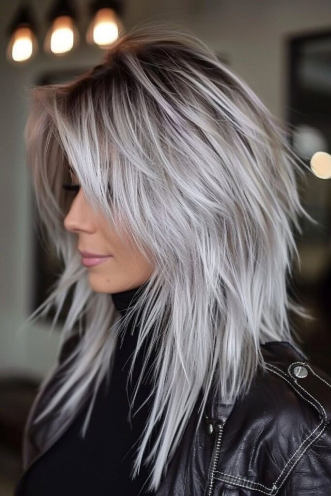 This look is perfect for those seeking a “cool” and “edgy” appearance. The hair color features a dramatic shade that starts with dark roots and transitions into intense ashy platinum blonde or silver tones throughout. These tones create an almost white effect in the light. The cut is one of the most dynamic versions of the shag, with a shoulder-length, heavily layered structure. The dense layers add incredible texture and volume to the hair. A messy fringe that frames the face from the sides and extends forward completes the style. The styling leaves a wind-swept, messy effect. This cut is ideal for adding volume to fine hair or movement to thick hair. When paired with a black turtleneck sweater and a leather jacket, the style takes on a rock-chic vibe.