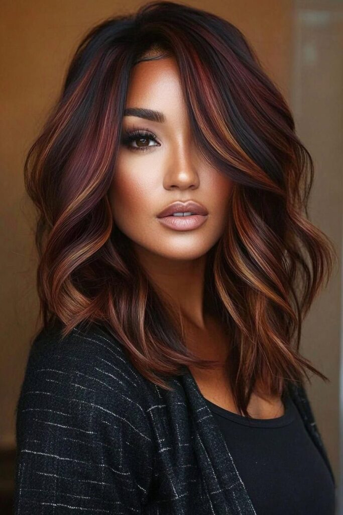 It shows how to use a warm, rich color palette on medium-length hair. The base color can be deep brown or black. However, the rich balayage highlights in red wine, copper, and caramel tones applied on top are what really make this color stand out. These warm, multidimensional colors enhance the hair’s movement, especially when hit by light. The layered lob haircut is shoulder-length, with the front sections falling toward the face. The hair is styled with soft, wide waves that emphasize the blending and flow of the colors. The makeup features bronze-toned contouring and nude-pink lips that complement the warm hues of the hair. This style is ideal for those who are tired of classic brown hair but are hesitant to commit to a full color change.