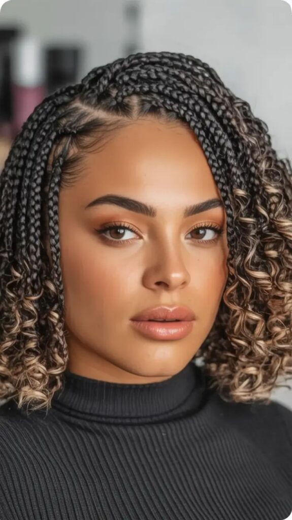 It combines the power of protective hairstyles and natural curls. The model’s fine, delicate micro-braids at the front hairline and edges offer a modern aesthetic while allowing the roots to rest. Most of the hair consists of dense, shiny, and defined curls. These curls add incredible volume and texture. The contrast between the neat lines of the braids and the free flow of the curls gives the style a dynamic feel. Warm-toned makeup and striking smoky eyes complete the look. The eye-catching tattoo on her arm serves as an accessory, emphasizing this unique and powerful expression. This style is an excellent source of inspiration for those seeking a chic yet practical hair solution.