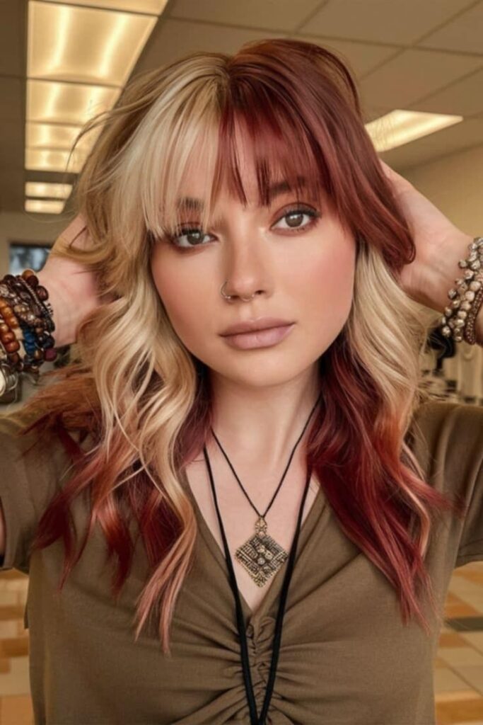 It offers a warmer, softer take on the two-tone hair trend. One side is light blonde or platinum, and the other is dark red or burgundy. The red fades into pink at the ends, creating a sweet transition. The shoulder-length haircut is layered and finished with a curtain fringe. The fringe is split down the middle and dyed different colors, making the style even more fun. The hair is styled with soft, messy waves. Bracelets and necklaces accessorize this look, achieving a bohemian and alternative vibe. This style is ideal for those who love dramatic contrast but prefer warmer tones.