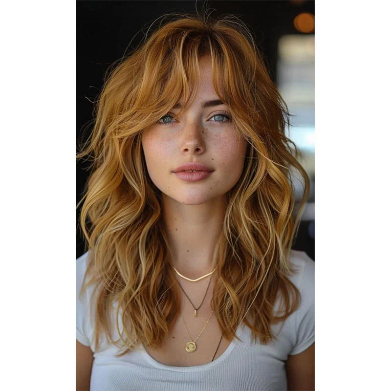 It demonstrates the attractiveness of natural, warm tones. The hair color falls between light copper and light auburn, giving it a sun-kissed appearance. It perfectly complements the model’s blue eyes and freckles. The medium-length, heavily layered, tousled shag cut style adds a modern touch. Curtain bangs gently frame the face, adding a modern touch to the cut. The layers give the hair natural volume and movement. The hair is styled with light waves and a tousled blowout. The makeup is finished with a natural, luminous look that accentuates the freckles. This style is perfect for those seeking an effortless, fresh look.