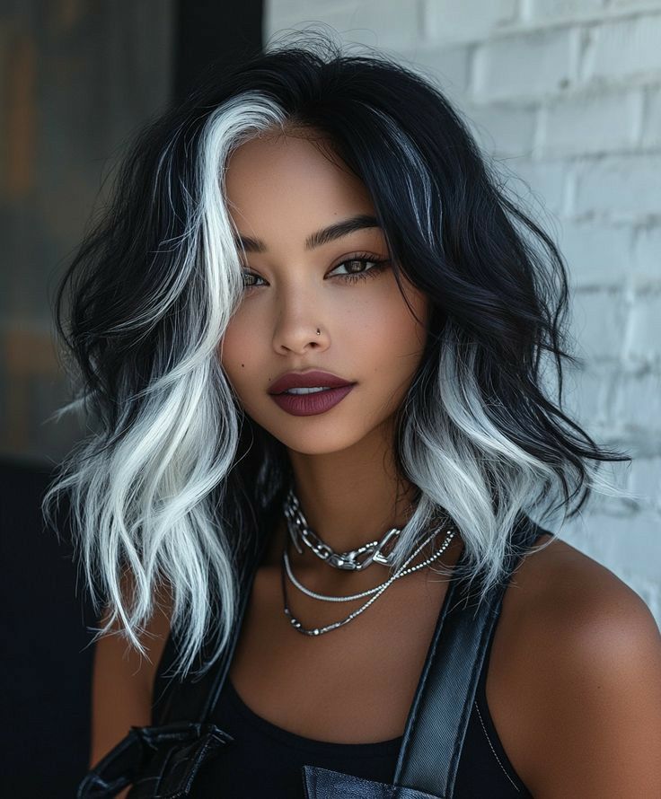 Also known as “half-and-half” or “Cruella de Vil,” this style reflects a bold, dramatic color trend. One side of the hair is a dark shade of black or brown, while the other is a rich shade of platinum blonde. This sharp color contrast creates a bold style. The medium-length cut has light layers and a tousled texture. A center part maximizes the contrast between the two colors. Bang and face-framing strands are also dyed two different colors, enhancing the color play. The hair is styled with soft waves that add texture despite the sharp color contrast. Neutral makeup tones draw attention to the hair color.