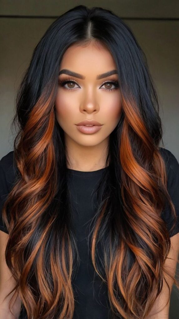 This is a testament to how striking bold color blocking and highlights can be. The model’s naturally dark black or very dark brown hair is accented with vibrant copper and orange balayage highlights. The highlights are concentrated at the front of the hair to frame the face. This technique is called the “money piece,” or face-framing highlights. It instantly draws attention to the face and creates a striking effect. The warm colors continue toward the lower sections of the hair and become more pronounced in wavy styles. The makeup maintains balance with warm, smoky eyes and nude lips that complement the hair color. This style is a risk-free, trendy option for those tired of solid black hair who don’t want to go completely blonde. It pairs well with darker skin tones.