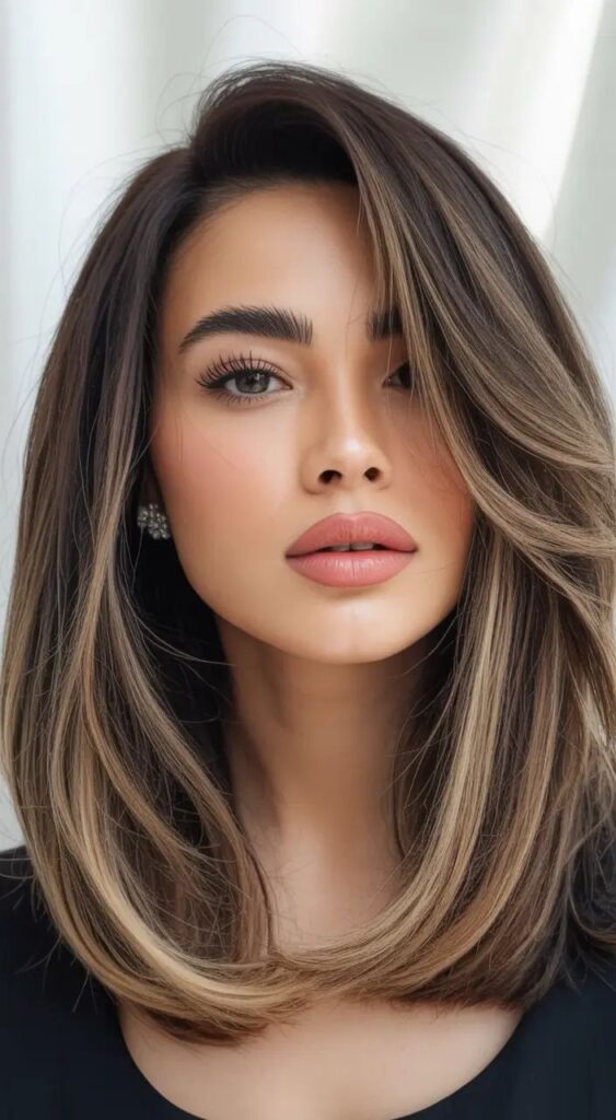 This is the epitome of a sophisticated, well-groomed look. The model’s hair color consists of thick, distinct highlights in caramel and light brown tones over a dark brown base. This “bronde” shade, a mix of brown and blonde, adds depth and dimension to the hair. The medium-length lob (long bob) has the ends cut inward. The main feature of the cut, however, is the voluminous blowout. The sides of the hair are curled outward while the ends are curled inward to create a frame. This blowout technique instantly makes the hair look luxurious and full. The makeup uses natural pink and peach tones to create a healthy-looking complexion. Thick, defined eyebrows add a modern touch, and full lips enhance the style’s appeal. This versatile hairstyle can adapt to any setting, from office chic to special events.