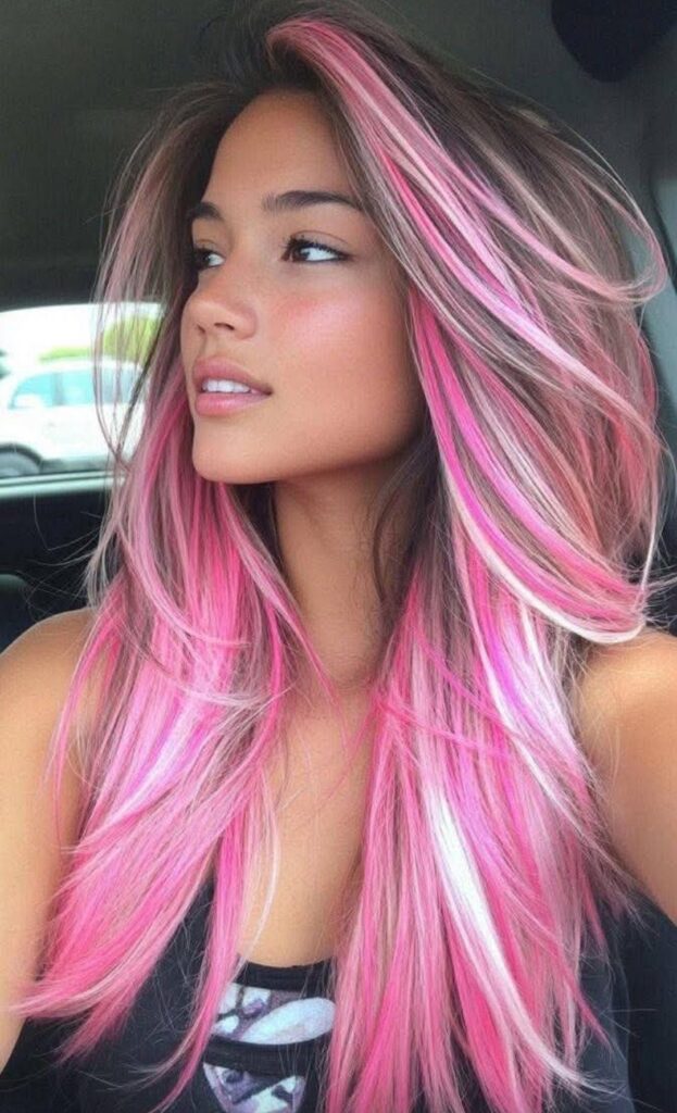 It showcases a creative and fun hair color trend. The model’s natural dark blonde or light brown hair has vibrant neon pink highlights and scattered white or platinum blonde streaks. This style is often referred to as “chunky highlights” or distinct color blocks surrounding the face. The intense use of pink gives the style a youthful, rebellious, and energetic vibe. The white tones make the pink stand out even more. The hair is cut in layers and styled with a windblown, dynamic blowout. This color choice is perfect for those who want to express their personality through their hair and love breaking the mold. It’s a fun style for summer festivals or any occasion when you want to stand out.
