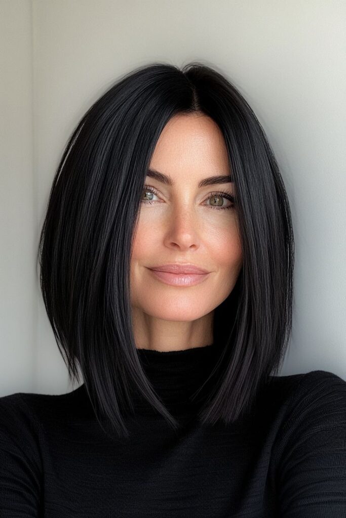 It showcases the power of the classic bob, one of the most iconic and timeless haircuts. The model’s hair is a rich, glossy black. This single color maximizes the sharpness and shine of the cut. The chin-length cut tapers slightly towards the back, creating an A-line shape. The hair is perfectly straightened for a sleek appearance. The center part and symmetrical cut create a sophisticated, sharp look. This style is ideal for those who love minimalism and modern elegance. The most important detail of this cut is a healthy shine. The makeup features a natural, glowing complexion, simple eye makeup, and nude lips. All the focus is on the hair’s flawless lines and shine.