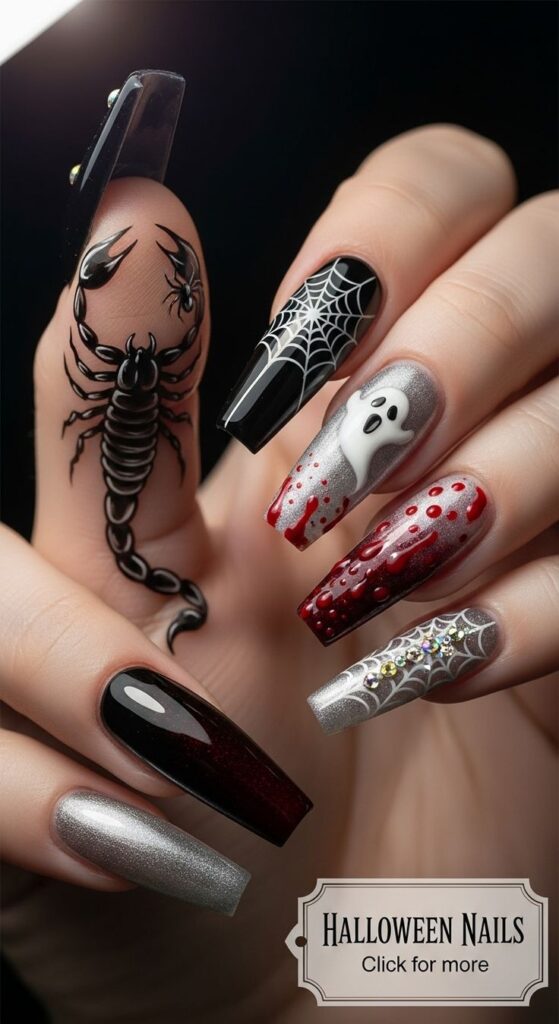 This manicure is a work of art, blending gothic and horror themes with masterful skill. Spider webs, blood droplets, and ghosts have been added to a black-and-silver glitter base. The transparent nails with a blood drop effect and the skeleton figure add terrifying, realistic touches to the design. This style is a great choice for those seeking a bold, unique look.
