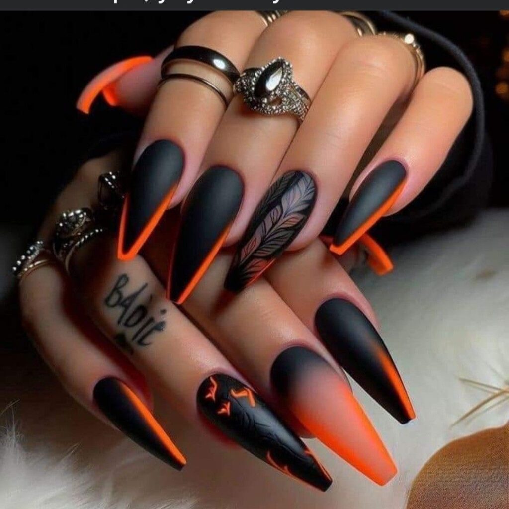 The vibrant neon orange French manicure lines, artfully applied over matte black nails, add a dynamic touch to the design, making it truly stand out. The beautiful orange ombre transitions at the fingertips and elegant feather details make this look edgy, chic, and sophisticated. It’s perfect for your everyday looks and for those special parties you won’t want to miss.