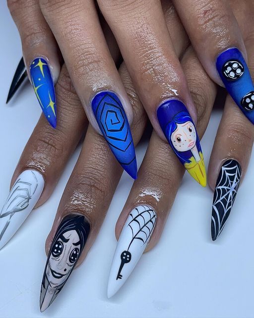 We’ve created this manicure especially for you, our beloved fans of animated films. We’re thrilled to tell you that it draws inspiration from the beloved movie “Coraline.” The spiral tunnel on the thumb, the main character figures on the other nails, and the symbolic spider web bring the film’s mysterious atmosphere to your nails. If you’re looking for something creative and eye-catching, you’re in the right place!