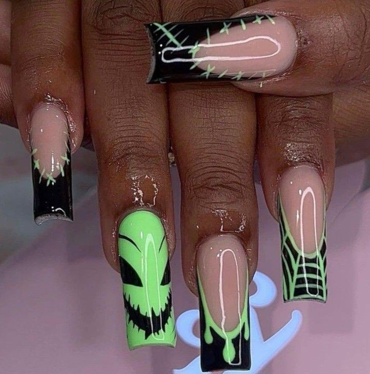 If you’re feeling bold and want to try something a little different, this neon green and black combination is the perfect choice. The stitched edges and dripping nail polish add a spooky vibe to the nails, while the iconic “Oogie Boogie” figure on a single finger gives the design a fun and frightening identity.