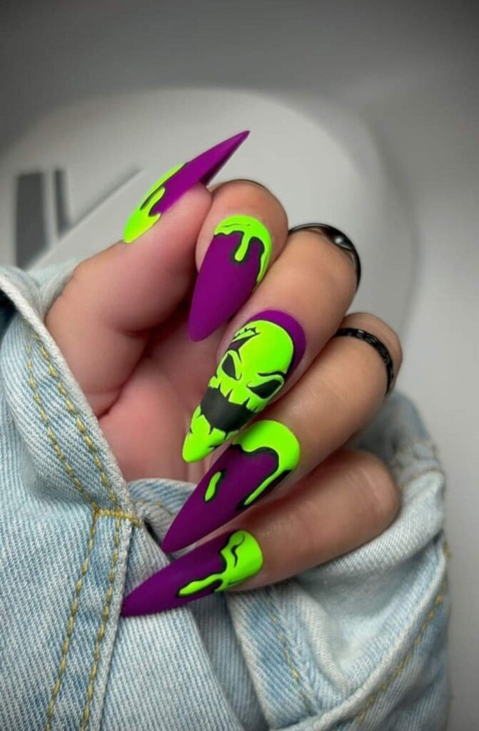 The beautiful mix of bright neon green and deep matte purple makes these nails look so modern and dynamic. The dripping paint effect and the spooky skull figure on a single nail make this design unforgettable. If you’re someone who loves to stand out at costume parties, this is a great option for you!