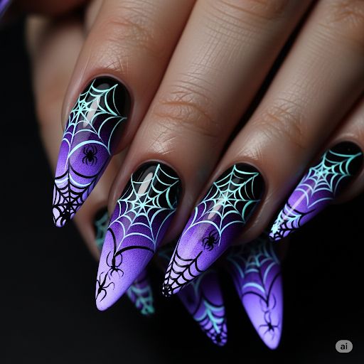 These nails are a modern take on the spooky season, with a mix of mysterious shades of purple and neon green spider web details. The tiny spiders on each nail add movement to the design, making it come alive. If you’re someone who loves details that glow in the dark, this manicure is a must-have!