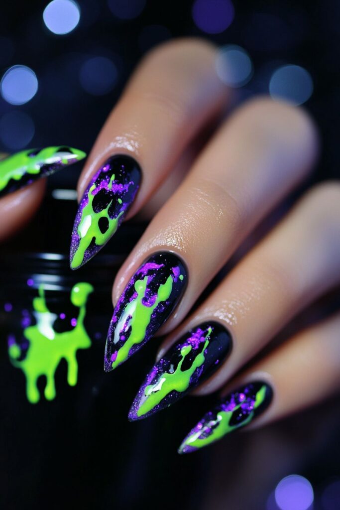 If you’re into a fun and slightly spooky style, this design is perfect for you! These adorable neon green “slime” figures look like they’ve splattered onto a glossy black background, and the purple glitter details make them pop. Your nails are going to look so cool! These nails are perfect for parties and Halloween events. They’ll definitely make you stand out!