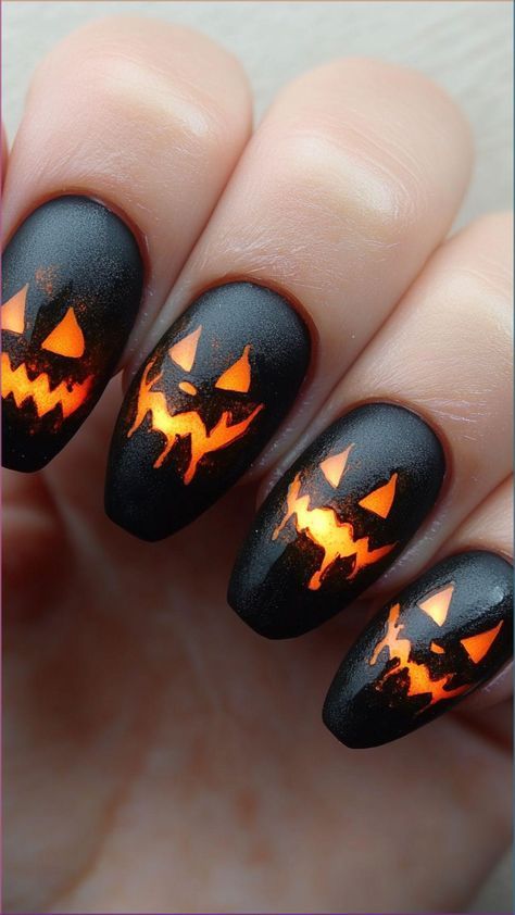 The pumpkin, the most iconic symbol of Halloween, has been interpreted in a minimalist and stylish way in this design. The orange pumpkin faces, which appear illuminated against a matte black background, offer a simple yet effective look. The matte finish of the nails really makes the orange pop, creating a beautiful contrast that’s sure to brighten your day. This design is perfect for Halloween, but it’s also elegant enough for everyday wear.