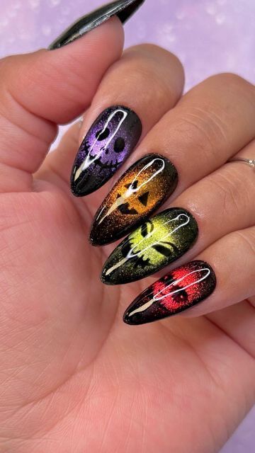 The little pumpkin figures glowing in different colors (purple, orange, yellow, red) on each nail add a mysterious and fun touch to the design. The black and glittery background really makes the colors pop!