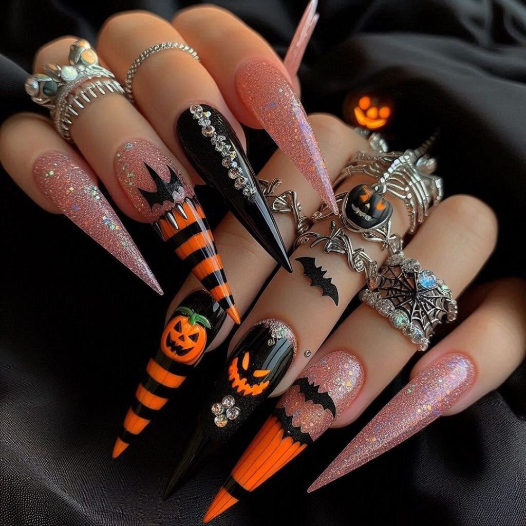 If you’re looking for something extra special to make a statement, this design is perfect for you! The bright pink glitter, bold striped patterns, and 3D pumpkin, spider, and bat figures make these nails a true work of art. I’m so excited to tell you about the different patterns! Each finger has its own unique story, and I just know you’re going to love how they come together. If you’re looking to be the belle of the ball this Halloween, this style is sure to make you stand out from the crowd.