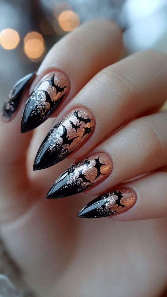 The beautiful blend of black and bronze/copper tones adds a warm and sophisticated touch to the nails. Black bat figures on a bronze glitter background create a dynamic and aesthetic look. The pointed shape of the nails adds a touch of gothic style, while the sparkle of the glitter adds movement. This style is a great choice for both Halloween parties and the fall season.