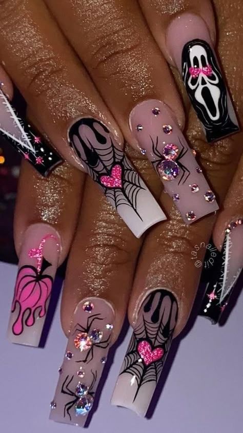 The nails have been styled with different lengths and shapes, adorned with spider webs, pink hearts, and sparkling stones. The light dancing off the nails really brings out the sparkle in the stones, making the whole design feel luxurious. If you’re looking to celebrate Halloween in a modern and chic way, this style is perfect for you!
