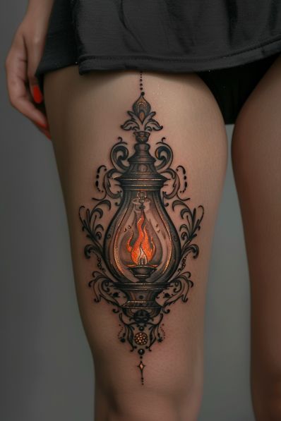 This is an incredibly detailed and realistic piece. With an antique gas lamp tattoo design, it practically glows with the warm, orange tones of the flame inside. The metallic texture of the lamp, the reflections on the glass, and the interplay of light are rendered masterfully. The ornate Gothic and Baroque-style filigree details surrounding the design lend it an elegant and sophisticated air. Typically carrying meanings such as “light in the darkness,” “hope,” or “guide,” this design is striking and powerful, especially on the upper leg.