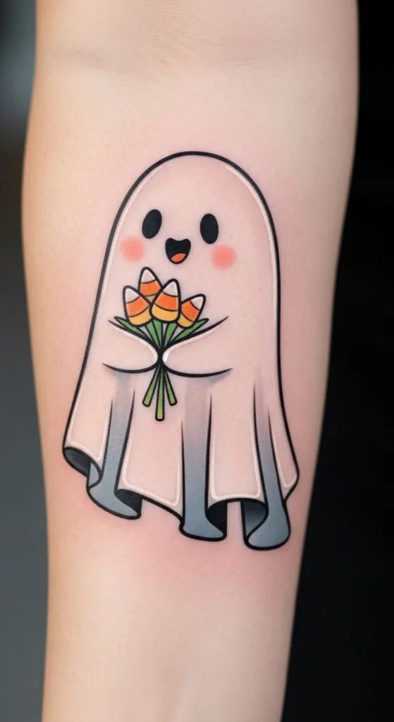 Cuteness alert! This “kawaii” style ghost tattoo is sure to melt hearts with its sweetness. With its rosy cheeks, happy smile, and bouquet of candy corn, it embodies pure Halloween cheer. Its simple design, smooth color transitions, and shading give it a clean, dimensional look. It’s a great source of inspiration for those looking for a small, minimalist tattoo that radiates positivity.