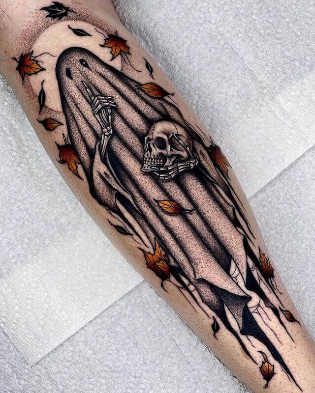 11) The Secret Inside the Ghost: Skeleton and Autumn Leaves Tattoo