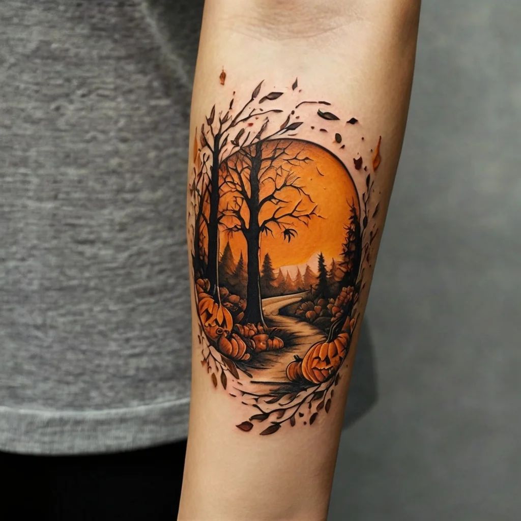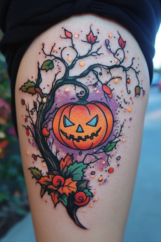 8) Vibrant Colors: Artistic Pumpkin and Autumn Tree Tattoo