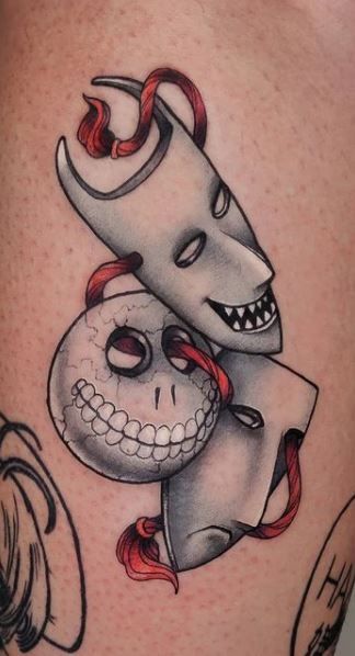 Tim Burton fans will recognize it immediately! This tattoo beautifully depicts the iconic trio of Lock, Shock, and Barrel from the movie The Nightmare Before Christmas. The cracks, shading, and characters’ eerie smiles are all rendered exceptionally well. The red string connecting the masks adds color to the design and symbolizes the trio’s inseparable bond. It’s a perfect choice for fans of pop culture and gothic animation.