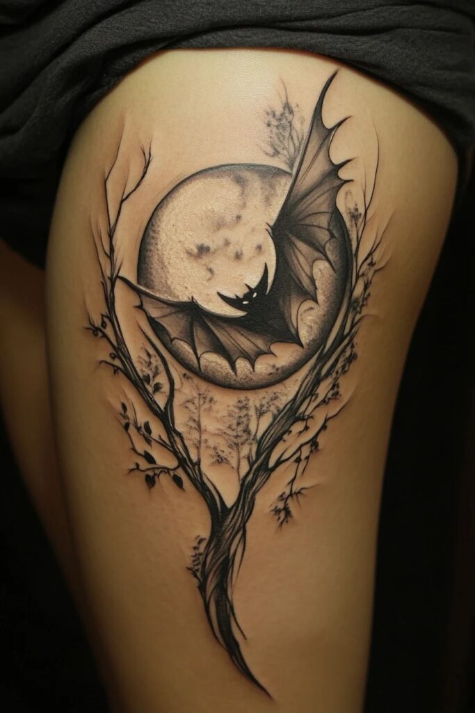 16) Gothic Night: Full Moon and Bat Silhouette Tattoo