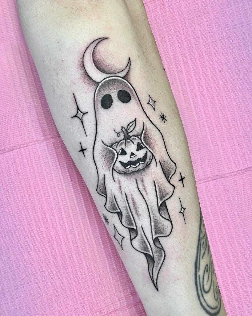 This is a beautiful blend of the “blackwork” and “illustrative” styles. This ghost tattoo features stunning shading that highlights the folds of its classic fabric. The crescent moon above its head, the tiny pumpkin in its hand, and the surrounding sparkles give the tattoo a mystical, celestial feel. This design reinterprets the ghost figure with a different aesthetic, looking both cute and mysterious.