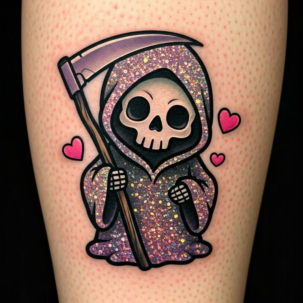 Death has never been this cute and sparkly! This “kawaii” (the Japanese art of cuteness) style Grim Reaper tattoo completely turns the classic scary figure upside down. The glitter effect on his cloak adds incredible texture and sparkle to the tattoo. With its tiny, adorable skull and scythe, as well as the surrounding pink hearts, this unique and fun design is perfect for those who want to portray dark themes in a cheerful way.
