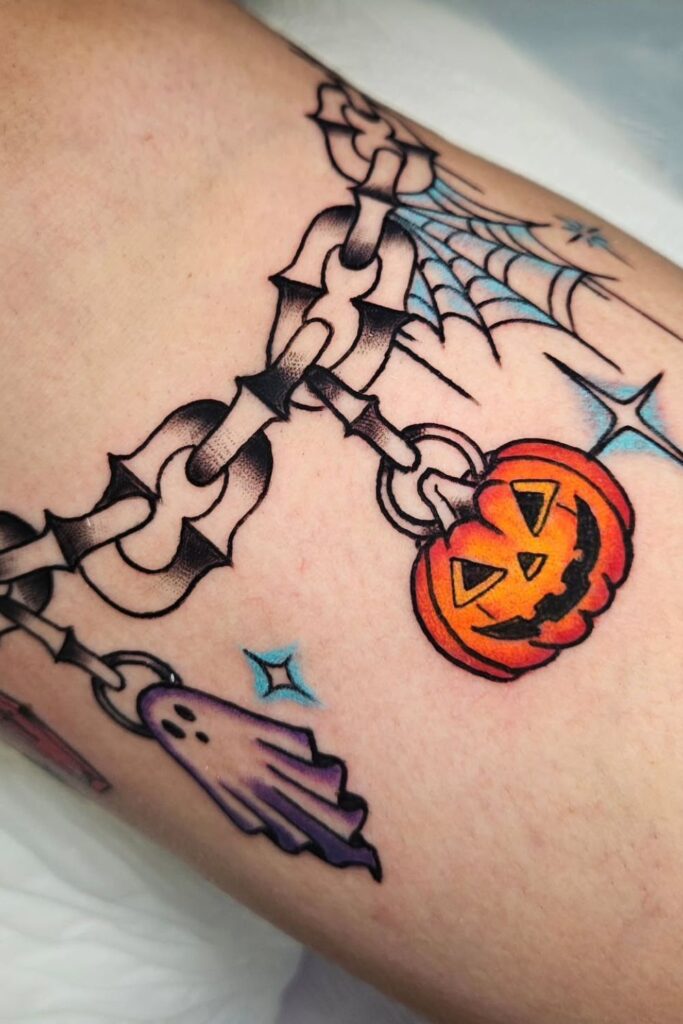 What a creative and fun concept! Designed like a charm bracelet, this tattoo features a chain made up of stylized bone figures. The adorable, tiny figures dangling from the chain are true Halloween classics: a bright orange pumpkin, a purple ghost, and a blue spiderweb. With its bold lines and vibrant colors, this tattoo design nods to the “neo-traditional” style. It offers a cheerful and unique alternative for those who want a permanent accessory that reflects their fun personality.