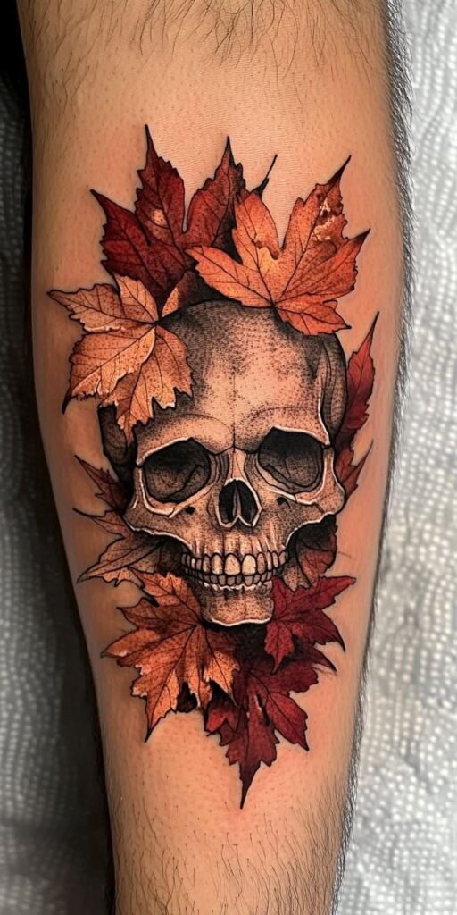 20) Autumn Melancholy: Skull and Maple Leaf Tattoo