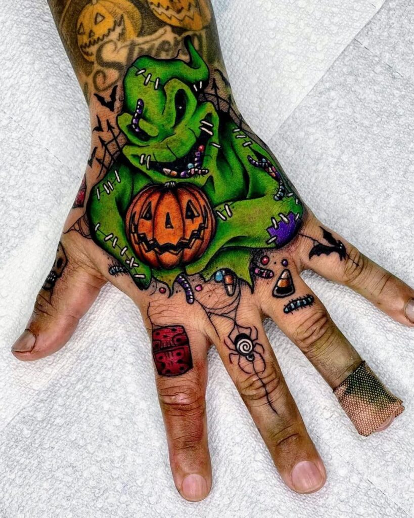 22) A Bold Choice: “Oogie Boogie” Hand Tattoo
