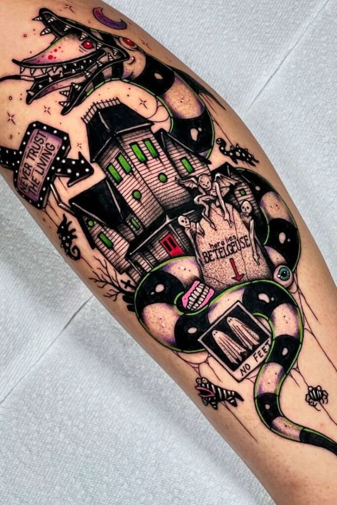 “Never trust the living!” This energetic and chaotic tattoo brings together all the iconic elements of the movie The Omen. It features the giant sand snake, the Maitland family’s haunted house, a gravestone inscribed with “Here lies Betelgeuse,” and a photo of the “ghost without feet.” The vibrant colors, especially the iconic green and purple, the bold lines, and the “neo-traditional” style make this tattoo as eye-catching as a poster. It’s the perfect piece for fans of 1980s and 1990s nostalgia and Tim Burton’s quirky world.