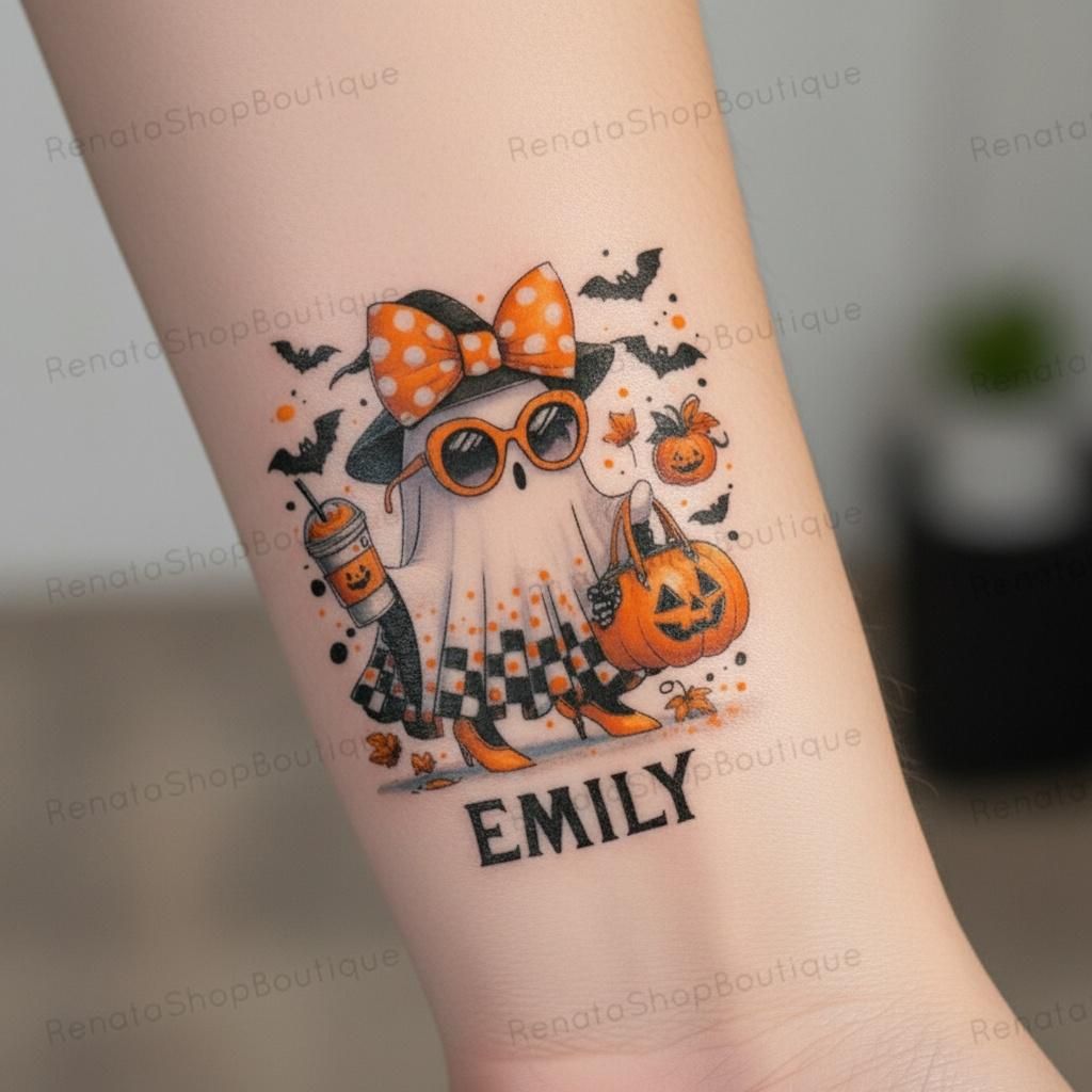 This takes the “cute ghost” concept to the next level! With her polka-dot ribbon, stylish sunglasses, plaid skirt, pumpkin-shaped bag, and pumpkin spice latte, this ghost is a true fashion icon. Adding the name “Emily” makes this tattoo personal and special. The use of vibrant orange colors and intricate details is fantastic. It’s a great idea for a fun, personal, fashion-loving Halloween enthusiast.
