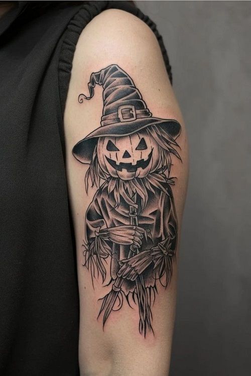 We’re going back to the roots of Halloween! This black-and-gray tattoo features a classic scarecrow in all its terrifying glory. With its eerie pumpkin-carved smile, witch’s hat, tattered clothes, and bony hands, it’s a true horror classic. The artist’s shading and texture work, especially on the straw and fabric, is commendable. This is a timeless and powerful design for lovers of traditional horror and Halloween aesthetics.