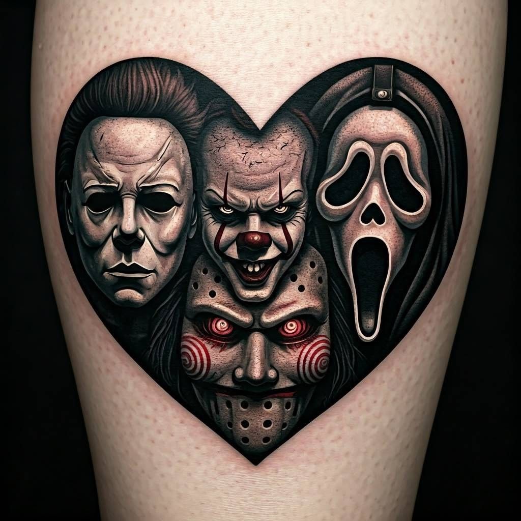 This is one of the most artistic ways to say, “I love horror movies!” Four of the greatest horror movie icons are masterfully placed within a heart-shaped frame: Michael Myers (Halloween), Pennywise (It), Ghostface (Scream), and Billy the Puppet (Saw). The level of detail in each portrait and how they capture the characters’ eeriness is incredible. This tattoo is one of the strongest examples of black-and-gray realism and the perfect collector’s piece for anyone who wants to carry their passion for horror on their skin.