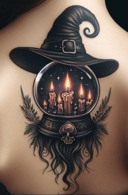 The level of detail and incredible realism are amazing! This back tattoo looks almost three-dimensional. The glass effect of the crystal ball beneath the witch’s hat, as well as the glow of the burning candles within, are mesmerizing. The ornate, metallic base adorned with skulls on which the sphere rests adds a gothic aesthetic to the design. It’s a powerful and impressive piece for those who love themes of prophecy, magic, and mysticism. The tattoo artist’s expertise in light and shadow is evident.