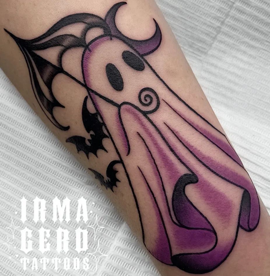 This ghost has a cute yet gothic style. Its soft purple shading gives the classic ghost figure a unique vibe. The tiny devil horns on its head, swirling eye, and spiderweb and bat details in the background bring the design closer to Tim Burton’s aesthetic. It’s a great source of inspiration for anyone looking for a fun, stylized, colorful Halloween tattoo.