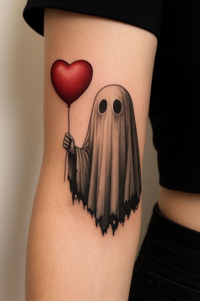 4) Cute Ghost and Red Heart Balloon Tattoo: A Sweet Touch