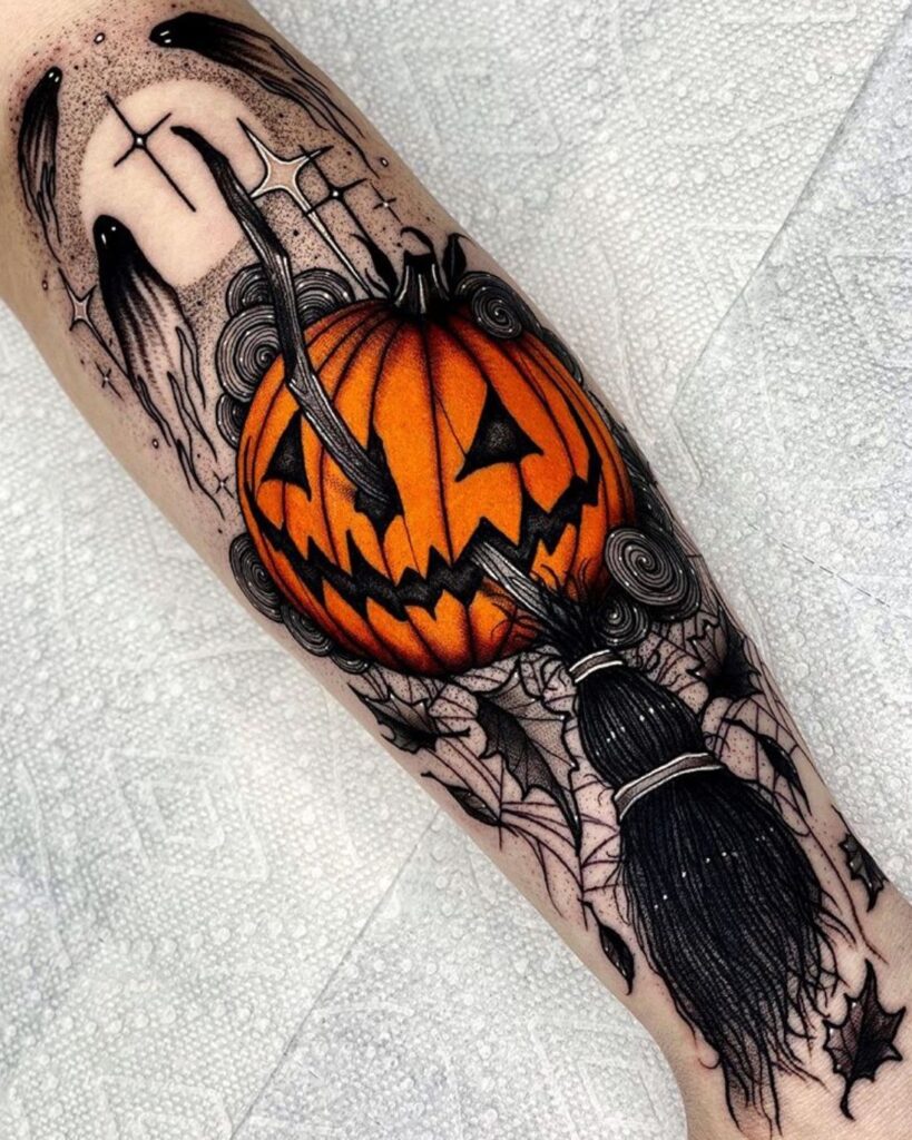 5) Dynamic Design: Pumpkin, Witch’s Broom, and “Blackwork” Tattoo