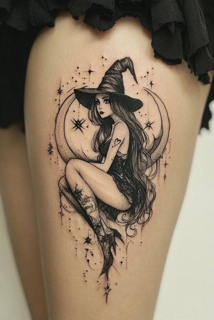 9) Mystical Elegance: Witch Sitting on the Moon Tattoo Design