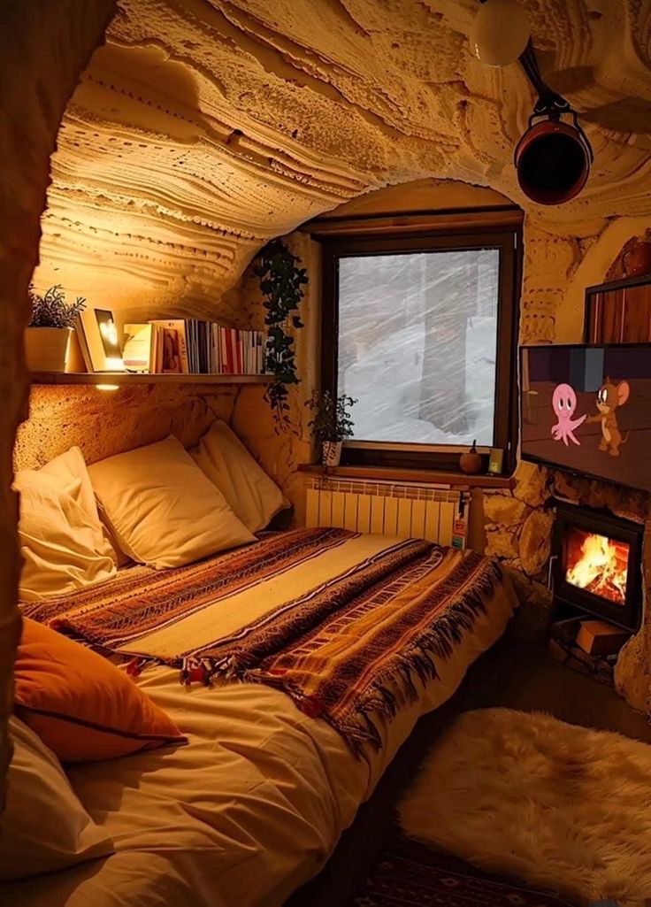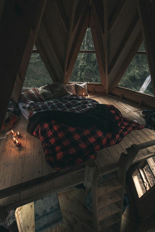Just look at this dreamy A-frame loft! Tucked high in the treetops, it feels like a secret hideout. The warm wooden walls and exposed beams create a rustic and inviting atmosphere. The huge windows offer an incredible, immersive view of the forest. I’m obsessed with the simple, low-to-the-floor bed piled high with plaid blankets—it just screams comfort! This loft isn’t just a place to sleep; it’s a tranquil sanctuary.
