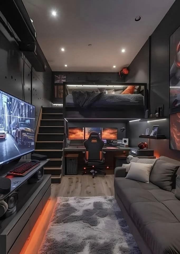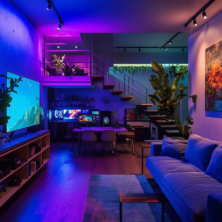 This living space blends a cozy living area with a high-tech gaming setup. The room’s ambient lighting creates a futuristic atmosphere. The main living area features a blue sofa and a plush rug. A gaming station with multiple monitors and vibrant backlighting is visible on the other side of the room.