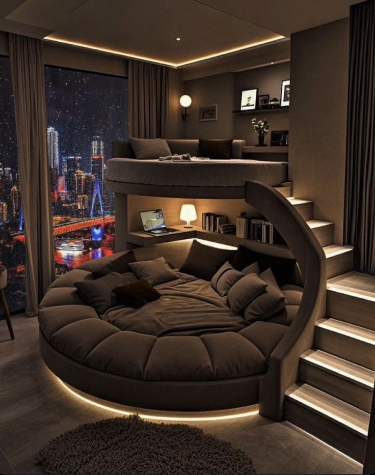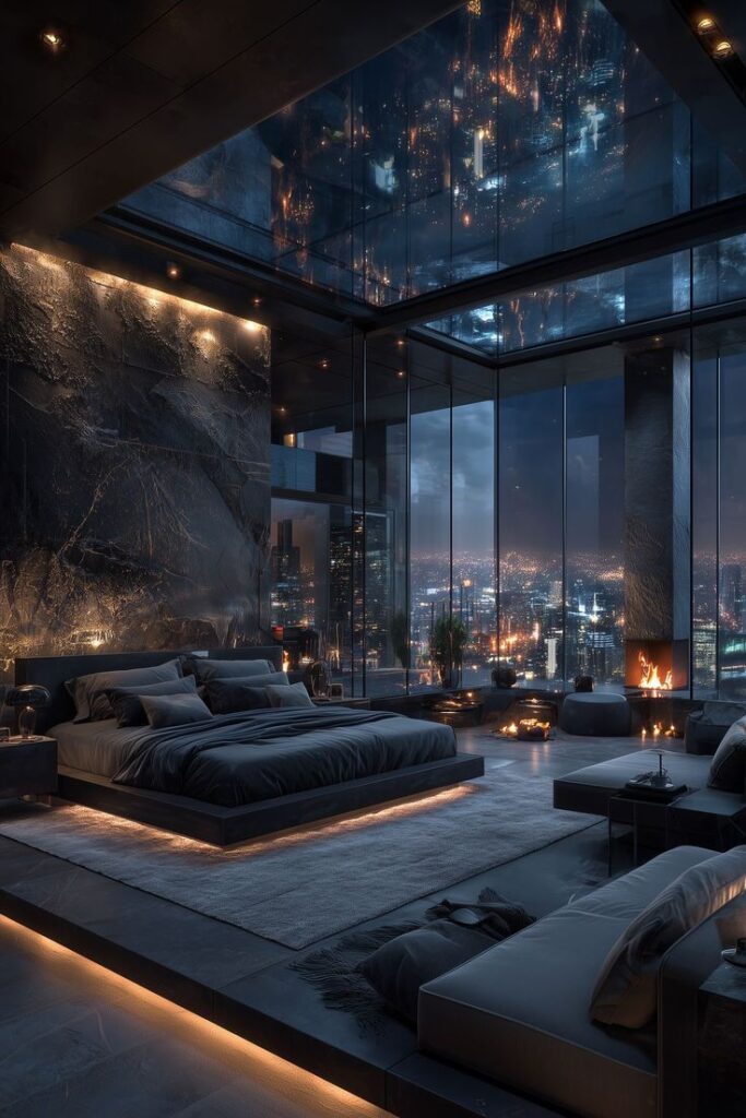 This bedroom is a masterpiece of urban luxury. Massive floor-to-ceiling windows offer a breathtaking panoramic view of the city, and an incredible mirrored ceiling reflects the dazzling lights, making you feel as if you’re floating above it all.
