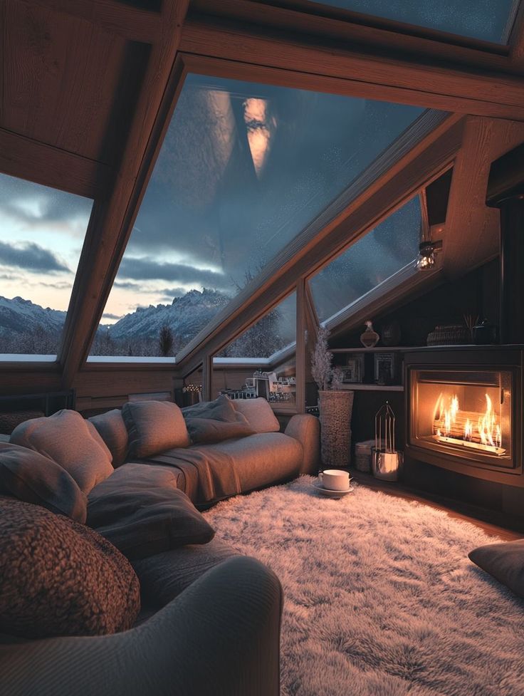 This space embodies cozy winter luxury. This gorgeous attic room has been transformed into a cozy lounge, perfect for a cold evening. The angled glass ceiling and windows offer a breathtaking panoramic view of a snowy mountain landscape, making you feel immersed in nature. Designed for ultimate comfort, the room features a low-profile, plush sofa piled with soft pillows and a thick, shaggy rug covering the floor.