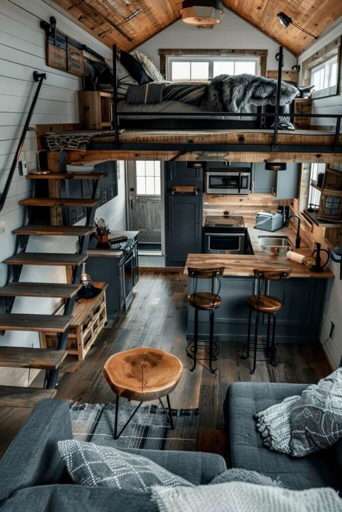 The kitchen is compact yet well-equipped with a small oven, microwave, and sink. Shiplap walls, dark metal accents, and warm lighting make the entire space feel trendy yet homey. This proves that a beautiful and comfortable home doesn’t require a lot of square footage.