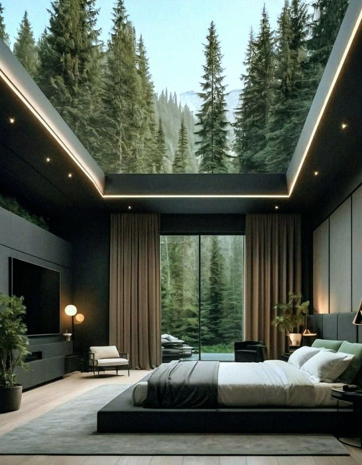 The dark, minimalist design creates a cozy retreat, but the real showstopper is the mirrored ceiling that reflects the forest outside, making you feel completely immersed in nature. The floor-to-ceiling window offers a stunning view and proves that you can have a luxurious, modern space while still feeling connected to the outdoors.